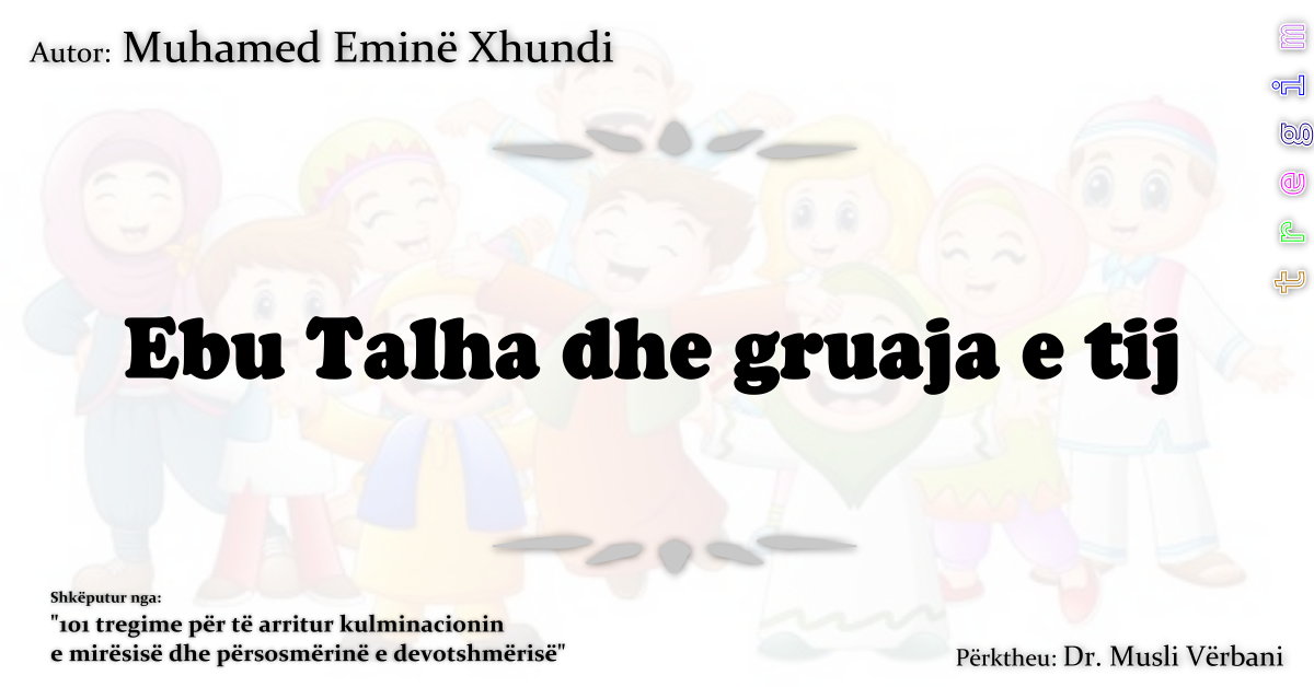 Transmeton Enesi r.a. se: Ebu Talha r.a. e kishte një fëmijë shumë të sëmurë. Ai del nga shtëpia për punë dhe djali i tij vdes. Kur u kthye në shtëpi, i thotë gruas së tij Umi Selijm: “Si është puna me fëmijën. Ka pushuar dhe është qetësuar (duke pasur për qëllim se ka vdekur)”, ndërsa Ebu Tahla ka menduar se është shëruar. Pas jacisë i afrohet gruas dhe kryen me te marrëdhënie aq mirë sa kurrë më parë. Kur e sheh se ai e ka përfunduar, pas një kohe të shkurtër i thotë: “O Ebu Tahla, çka mendon, nëse marrin borxh në një shtëpi, e pas një kohe familja e asaj shtëpie e kërkon borxhin, a është e drejtë t’ia ndalosh?” Thotë: “Jo.” Ajo i thotë: “Konsideroje fëmijën tënd (fëmija yt ka vdekur e kërko shpërblim prej Zotit).” Thotë Enesi: “Ai hidhërohet me gruan e tij dhe i thotë: “Më ke lënë që të bëhem i papastër (xhunub) prej marrëdhënieve, e tani po më tregon për fëmijën?!” Pastaj del prej shtëpie, shkon te i Dërguari i Allahut s.a.v.s. dhe i tregon çka i ka ndodhur. Muhamedi s.a.v.s. i thotë se gruaja jote ka vepruar me të drejtë dhe është lutur: “Zoti e bekoftë natën e