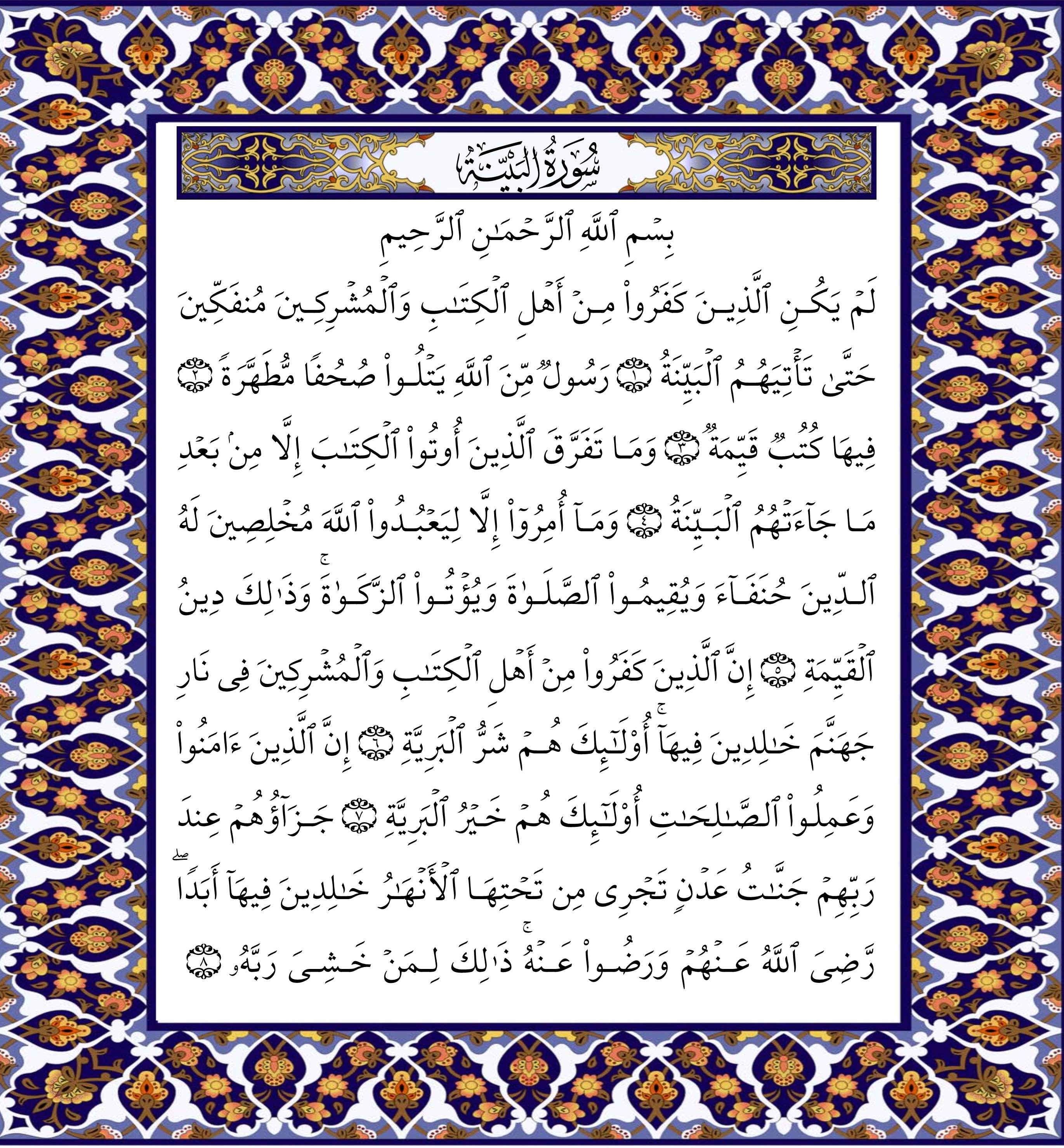 | “S’ka dyshim se ata, të cilët nuk besuan nga ithtarët e librit dhe nga idhujtarët, do të jenë në zjarrin e Xhehennemit, aty do të jenë përgjithmonë. Të tillët janë krijesa më e dëmshme.” |