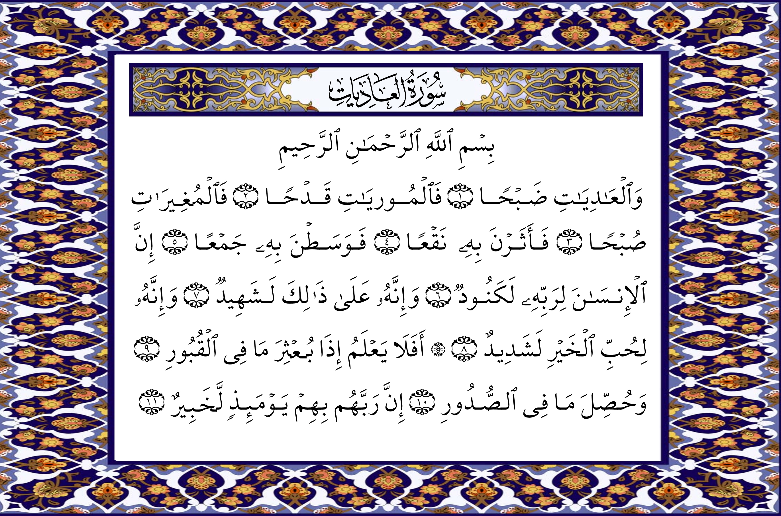 | “Pasha vrapuesit e shpejtë (kuajt) që hingëllojnë! E që me thundrat e tyre nxjerrin xixëllima zjarri nga gurët, Dhe të cilët vërsulen herët në agim. E me të (vërsulje) atëherë çojnë pluhur. Dhe ashtu hidhen në mesin e grumbullit (të armikut).” |