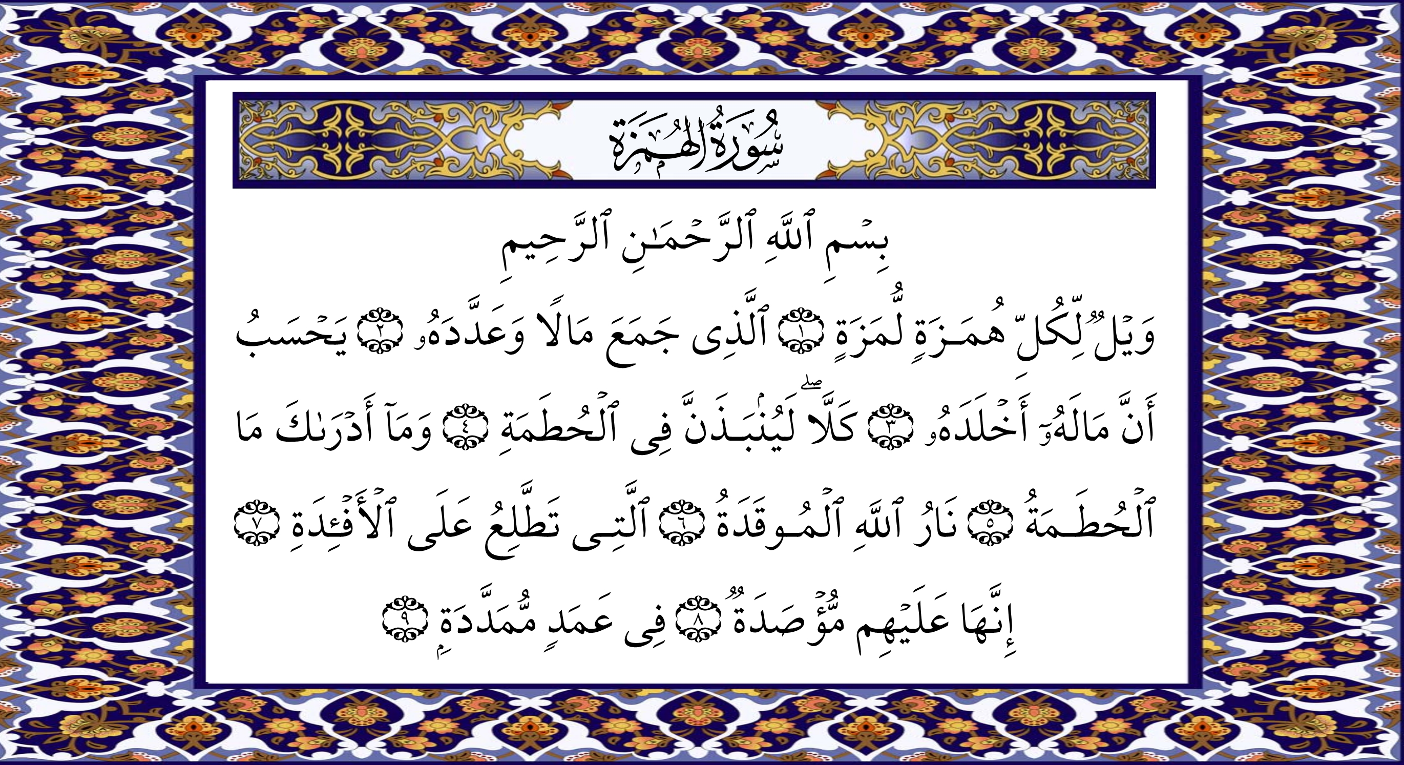 | El-ledhii xhemea maalen ve addedehu Jahsebu enne malehuu ehledehu |