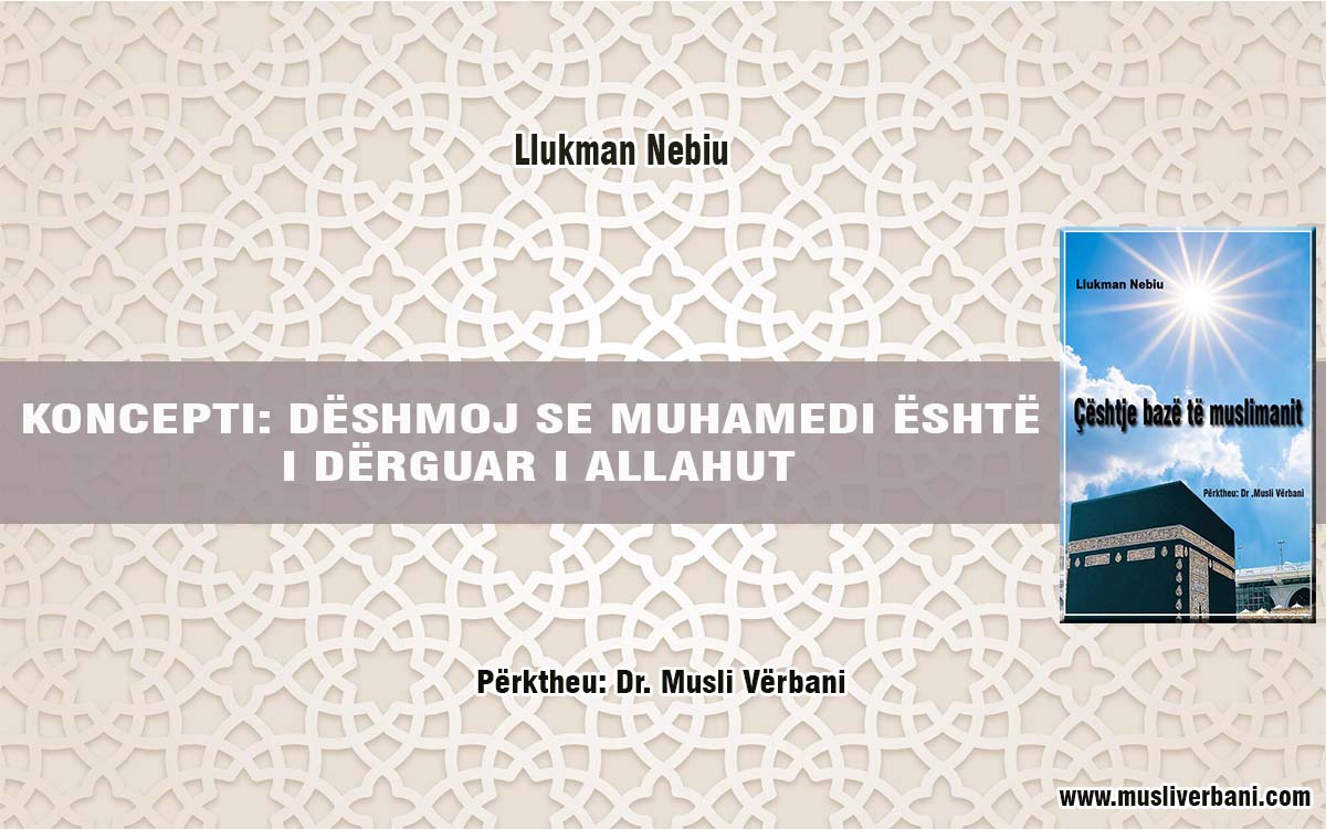 E di, besoj dhe e pranoj se Muhamedi a.s., i biri i Abdullahut, i biri i Abdul Mutalibit, i biri i Hashimit, i biri i Abdul Menafit Kurejshit, është rob i Allahut dhe i dërguar i Allahut për gjithë njerëzimin.