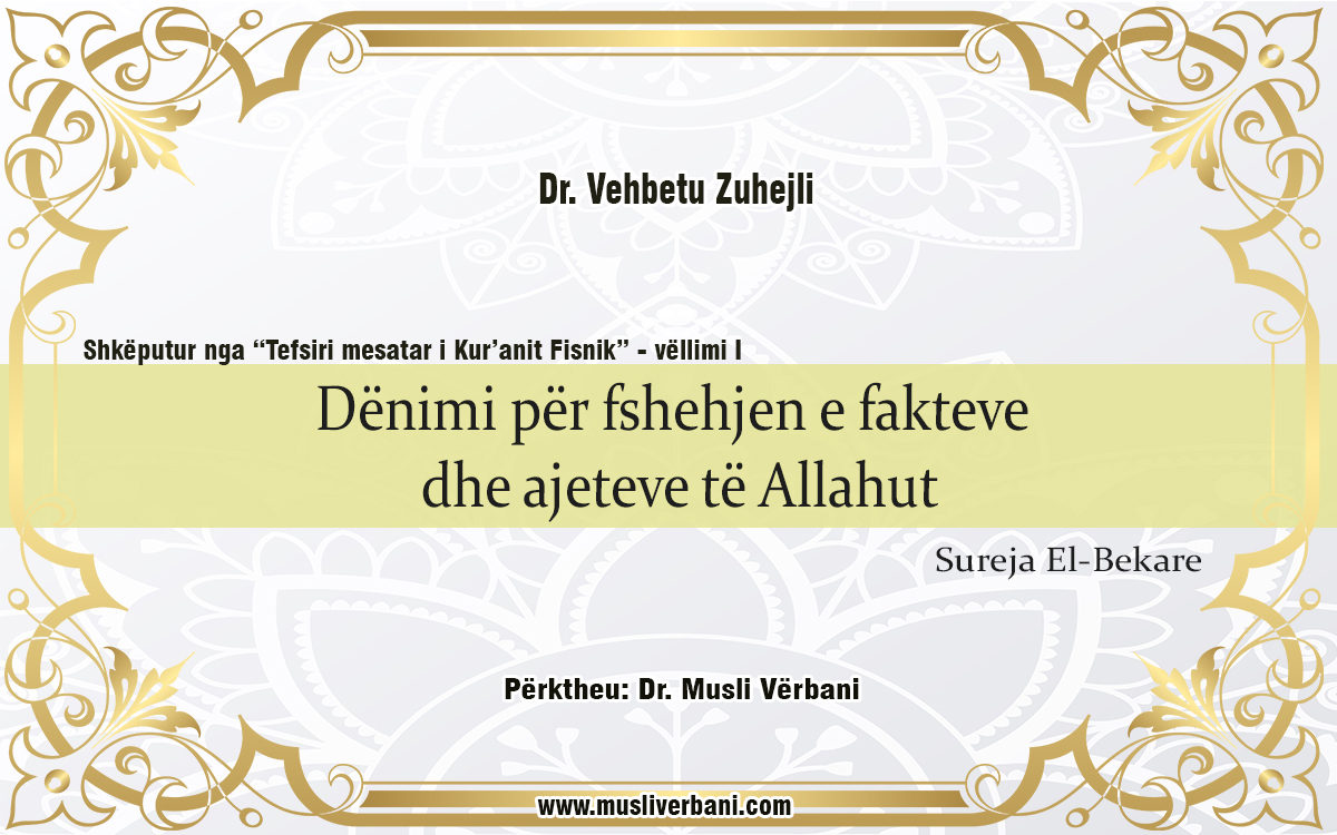 Ata që fshehin nga libri atë që shpalli Allahu dhe për të fitojnë shumë të paktë, ata në barqet e tyre fusin vetëm zjarr. Atyre Allahu nuk do t’u flasë në ditën e gjykimit dhe as nuk i shfajëson ata, por për ta pason dënimi i rëndë e i padurueshëm. (174) Ata janë që në vend të udhëzimit e morën humbjen dhe dënimin në vend të shpëtimit. Sa të durueshëm qenkan ata ndaj zjarrit? (175) Atë (dënim) për shkak se Allahu e zbriti librin (Tevratin), me sqarim të drejtë, e ata që bënë ndryshime në librin, janë në një përçarje të largët nga e vërteta. (176)