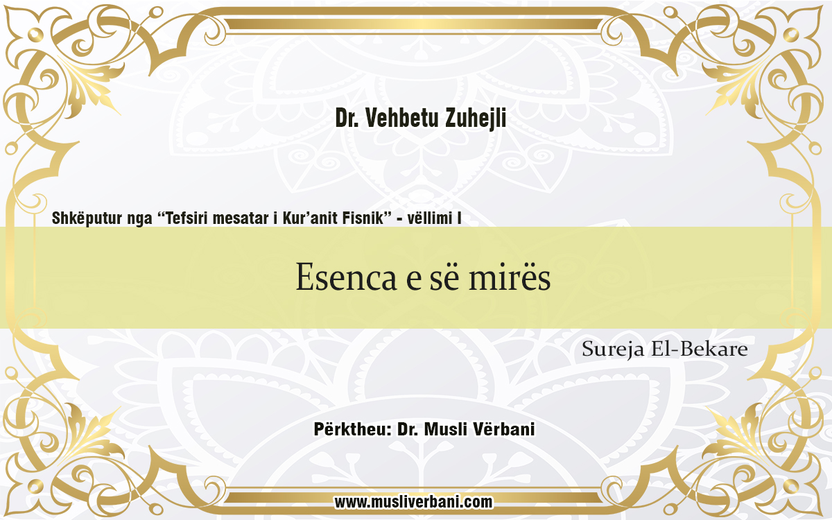 Allahu ka dëshiruar që t’u sqaroj të gjithë njerëzve se esenca e fesë nuk është vetëm orientimi në një drejtim të caktuar. Vetëm ashtu nuk arrihet e mira e dëshiruar. Por mirësia është term gjithëpërfshirës i të mirave, ndërsa për secilën vepër të dashur është çështje tjetër. Nuk është drejtimi drejtim i fytyrës në lindje dhe perëndim, por besimi në Allahun dhe në të dërguarin e Tij duke ia bashkëngjitur veprat e mira.