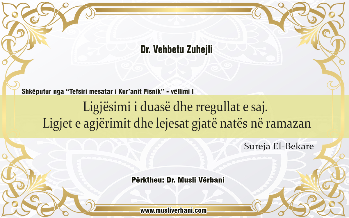 Natën e agjërimit u është lejuar afrimi të gratë tuaja, ato janë prehje për ju dhe ju jeni prehje për ato. Allahu e di se ju e keni mashtruar vetveten, andaj ua pranoi pendimin tuaj dhe ua fali gabimin. Tash e tutje bashkohuni me to dhe kërkoni atë që ua ka caktuar Allahu dhe hani e pini derisa qartë të dallohet peri i bardhë nga peri i zi në agim, e pastaj agjërimin plotësojeni deri në mbrëmje. E kur jeni të izoluar (në i’tikafë) në xhamia, mos t’u afroheni atyre (për marrëdhënie intime). Këto janë dispozitat e Allahut, pra mos i kundërshtoni. Ja kështu, në këtë mënyrë Allahu ua sqaron njerëzve argumentet e veta që ata të ruhen. (187)