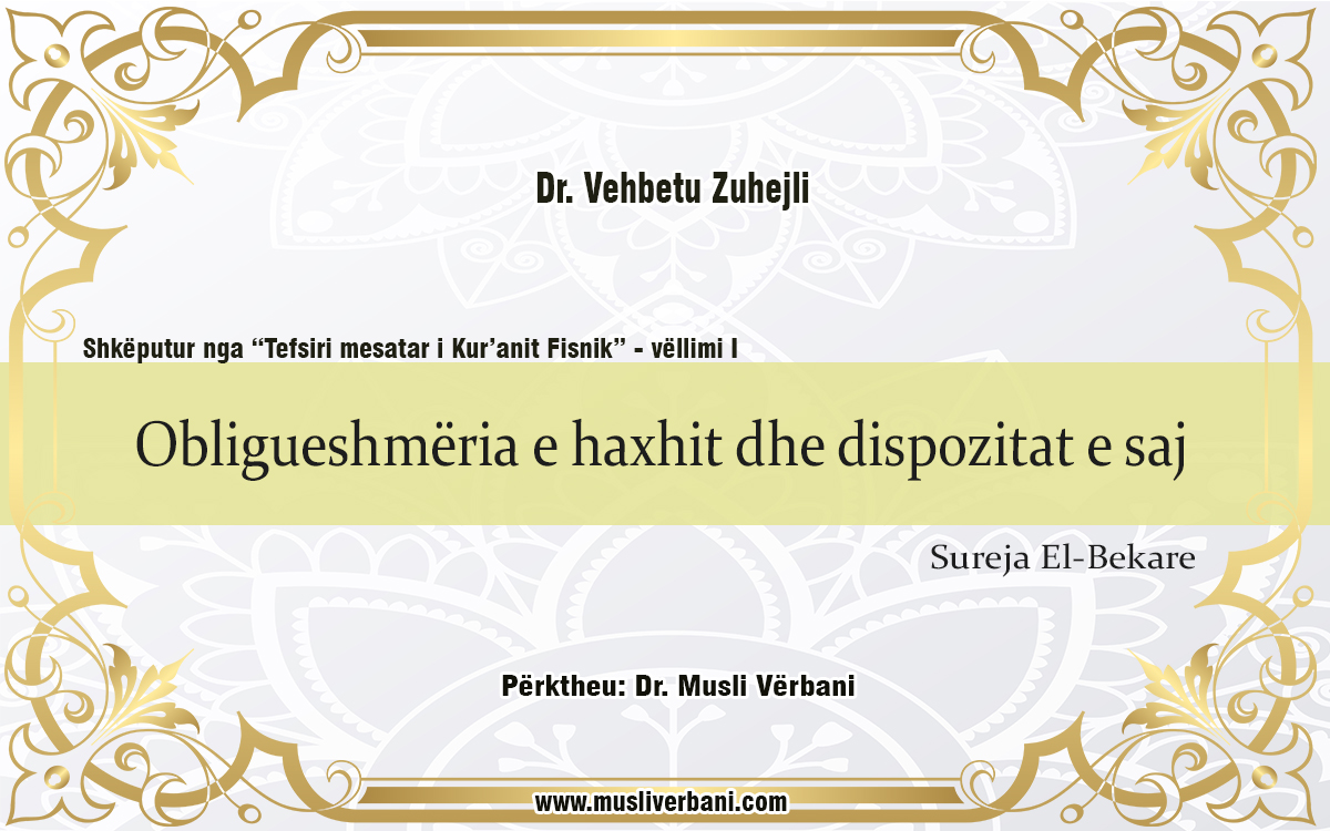E kryejeni haxhin dhe umren për hir të Allahut, po në qoftë se pengoheni, atëherë (therni për kurban) çka t’ju vijë më lehtë prej kurbaneve, e mos i rruani kokat tuaja derisa të arrijë kurbani vendin e caktuar. Po kush është prej jush i sëmurë ose ka mundim koke (e rruhet para kohe) kompensim është: agjërim, sadaka ose kurban. E kur jeni të sigurt, ai që bënë umren para haxhit (duhet therë) një kurban që i vjen më lehtë, mirëpo nëse nuk ka, le të agjëroj tri ditë gjatë haxhit e shtatë ditë kur të ktheheni, këto janë dhjetë ditë të plota. Ky është rregull për ata që nuk kanë familjen pranë xhamisë së shenjtë. Pra kijeni drojë Allahun dhe dijeni se Allahu është ndëshkues i rreptë. (196)