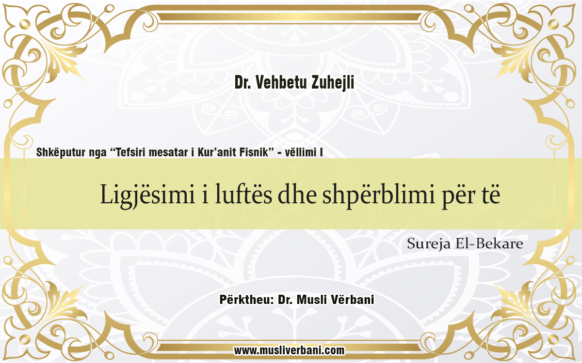 Të pyesin për luftën në muajin e shenjtë, thuaj: “Lufta në të është e madhe (mëkat i madh), por pengimi nga rruga e Allahut, mosbesimi ndaj Tij, pengimi nga xhamia e shenjtë (Qabja) dhe dëbimi i banorëve të saj nga ajo, janë mëkate edhe më të mëdha te Allahu. E fitneja është edhe më e madhe se mbytja. Ata do t’u luftojnë juve vazhdimisht për t’ju zmbrapsur, nëse munden, nga feja juaj. E kush zmbrapset prej jush nga feja e tij dhe vdes si pabesimtar, ata i kanë zhdukur veprat e veta në këtë jetë dhe në jetën tjetër. Të tillët janë banorë të zjarrit dhe në të do të qëndrojnë përjetshëm. (217)