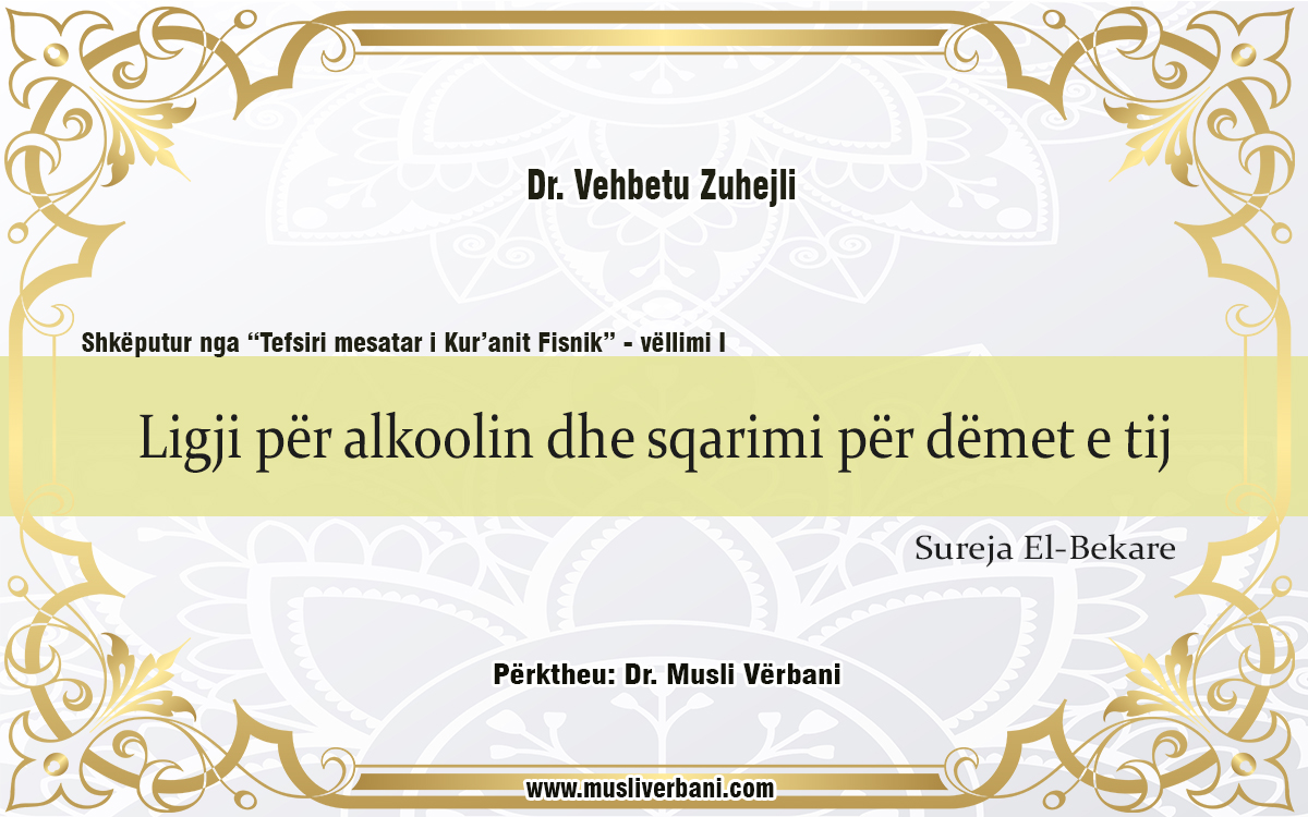 Të pyesin ty për verën dhe bixhozin. Thuaj: “Që të dyja janë mëkat i madh, e ka edhe dobi në to (të pakta) për njerëz, por dëmi i tyre është më i madh se dobia e tyre. Të pyesin ty edhe se ç’do të japin. Thuaj: “Tepricën!” Kështu ua sqaron Allahu juve argumentet ashtu që të mendoni (çka është mirë e çka është keq). (219)