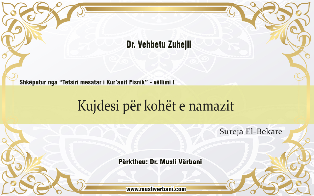 Vazhdoni rregullisht namazet (faljet), e edhe atë namazin e mesëm, dhe ndaj Allahut të jeni respektues (në namaze). (238) E nëse keni frikë (nga armiku), atëherë faluni duke ecur ose duke kalëruar, por kur të jeni të siguruar, përkujtoni (me namaz) Allahun ashtu si u mësoi Ai për atë që ju nuk dinit. (239)