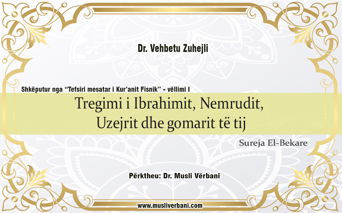A nuk ke arritur të dish për atë që përse Allahu i kishte dhënë pushtet, ai (Nemrudi) polemizoi me Ibrahimin rreth Zotit të tij. Kur Ibrahimi tha: “Zoti im është Ai që jep jetë dhe vdekje!” Ai tha: “Edhe unë jep jetë dhe vdekje!” Ibrahimi tha: “Zoti im e sjell diellin nga lindja, sille pra ti atë nga perëndimi?” Atëherë ai që nuk besoi mbeti i hutuar. Allahu shpie në rrugë të drejtë popullin mizor. (258) Ose (nuk je i njohur) me shembullin e atij që kaloi pranë një fshati që ishte rrënuar në kulmet e tij, e tha: “Si e ngjallë Allahu këtë pas shkatërrimit të tij?” e Allahu e bëri të vdekur atë (pyetësin – Uzejrin) njëqind vjet, pastaj e ringjalli dhe i tha: “Sa qëndrove (i vdekur)?” Ai tha: “Një ditë, ose një pjesë të ditës!” Ai (Allahu) Tha:” Jo, por ke ndenjur (i vdekur) njëqind vjet, shikoje ushqimin dhe pijen tënde si nuk është prishur, e shikoje edhe gomarin tënd (si i janë shkapërderdhur eshtrat). E për të bërë ty argument për njerëzit (bëmë këtë sprovë), shiko se si i kombinojmë eshtrat e pastaj i veshim me mish. E kur iu bë e qartë atij tha: “U binda se me të vërtetë Allahu ka mundësi për çdo send!” (259) “Përkujto kur Ibrahimi tha: “Zoti im, më mundëso të shoh se si i ngjallë të vdekurit?” Ai (Zoti) tha: “A nuk beson?” Ai (Ibrahimi) tha: “Po, por desha që zemra e ime të ngopet (bindje)!” Ai (Zoti) tha: “Merri katër shpezë pranë vete (theri e copëtoji), e pastaj në çdo kodër vendose nga një pjesë të tyre, mandej thirri ato, do të vijnë ty shpejt, e dije se Allahu është i Gjithëfuqishmi, i Urti.” (260)