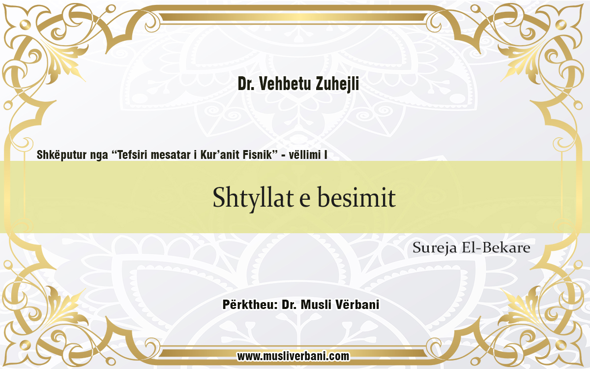 I Dërguari beson në atë (Kuranin) që i është shpallur nga Zoti i tij e po ashtu dhe besimtarët: të gjithë besojnë në Allahun, engjëjt e Tij, librat e Tij dhe të dërguarit e Tij (duke thënë): “Ne nuk bëjmë dallim mes asnjërit prej të dërguarve të Tij”. Ata thonë: “Ne dëgjojmë dhe bindemi. Faljen Tënde kërkojmë, o Zoti Ynë dhe te Ti do të kthehemi!” (285)
