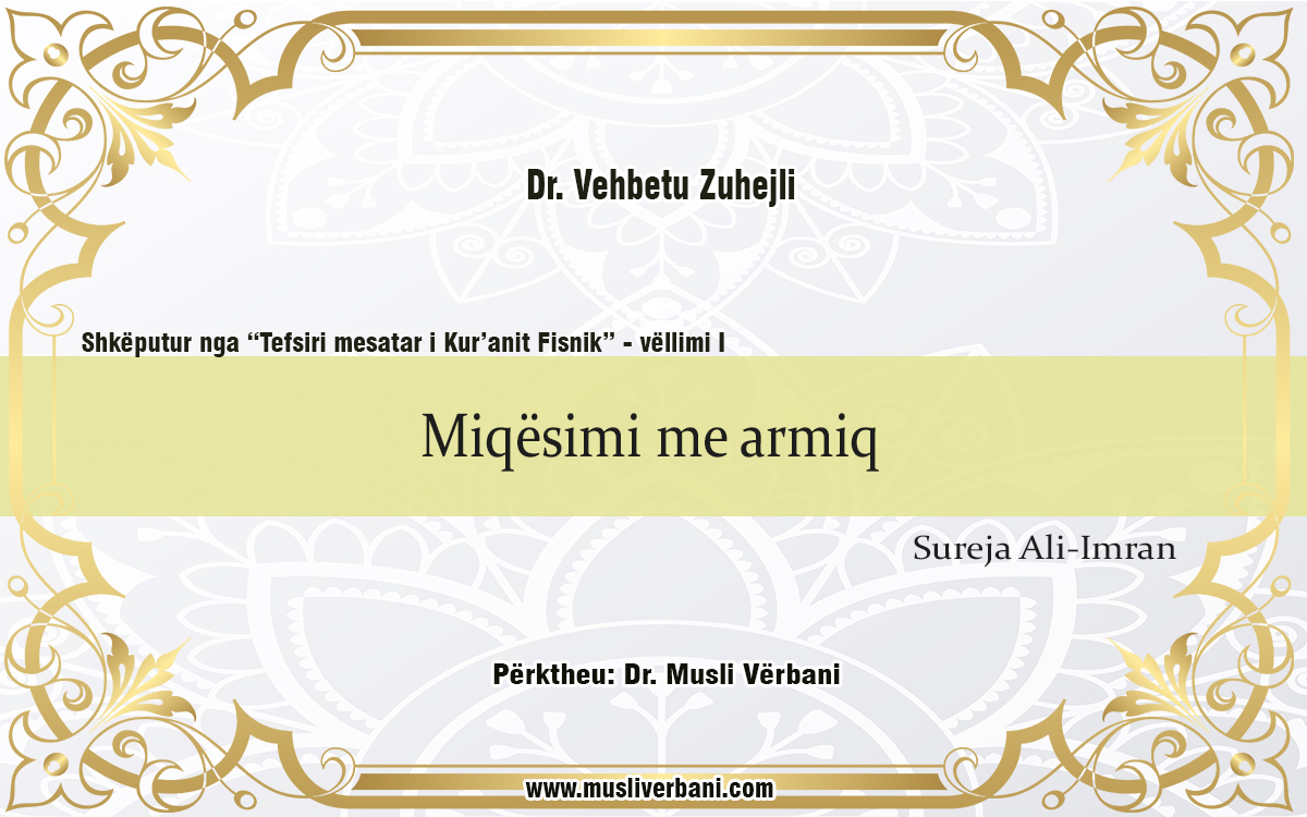 Besimtarët të mos i miqësojnë mosbesimtarët, e t’i lënë manash besimtarët. E kush bën atë, ai nga feja e Allahut nuk ka asgjë, përveç për qëllim ruajtja prej të keqes së tyre. All-llahu jua tërheq vërejtjen prej (dënimit të) Tij pse vetëm te All-llahu është e ardhmja. (28)