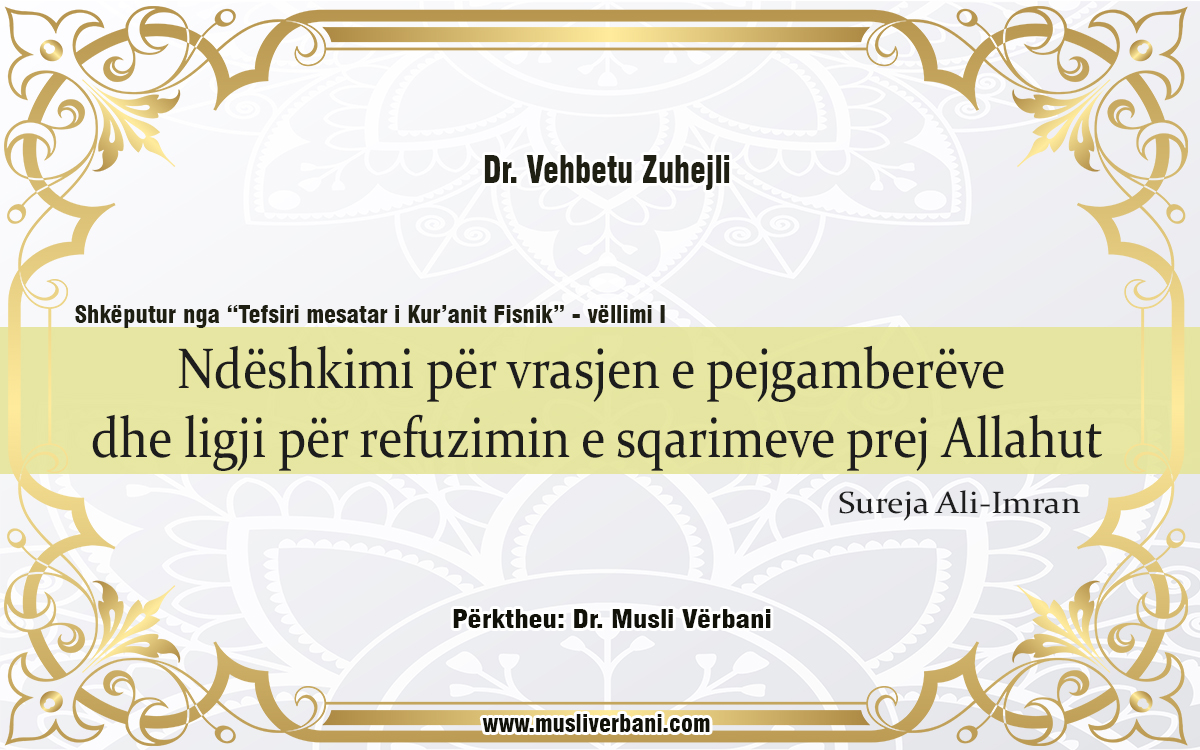 A nuk i sheh ti ata, të cilëve u është dhënë mjaft nga libri, kur të thirren që ndërmjet tyre të gjykojë libri i Allahut, se si një grup prej tyre prapësohej. Ata janë refuzues. (23) E atë (e bënin) ngase ata thoshin: “Neve nuk do të na djegë zjarri vetëm se për pak ditë të numëruara, e ajo që shpifën për fenë e tyre, i mashtroi keq. (24) E, si do të jetë gjendja e tyre kur Ne do t’i tubojmë ata një ditë, për të cilën nuk ka dyshim dhe çdo njeriu do t’i ofrohet ajo që e ka e fituar, duke mos iu bërë atyre asnjë e padrejtë. (25)