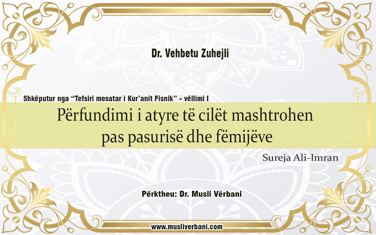 Një pjesë e njerëzve krenohen me pasuri, me fëmijë dhe me pasardhës. Ata mendojnë se në krahasim me të tjerët janë më të privilegjuarit në këtë botë dhe më të mirët edhe në botën tjetër. Nuk e kuptojnë se pasuria dhe fëmijët janë hije e cila zhduket dhe humbet, përderisa e mira është në rrugën e drejtë dhe në veprat e mira.