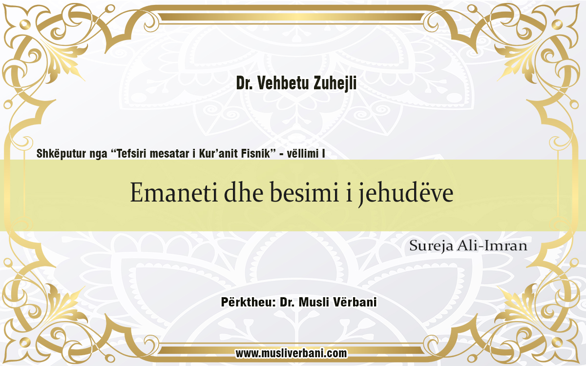 Ndër ithtarë të librit ka aso që po ia besove një sasi të madhe (ari), ai ta kthen ty atë, por ka të atillë që po ia besove një dinarë, ai nuk ta kthen ty atë, përveç nëse gjithnjë i rri gati (ia kërkon pajanda). Këtë (e bëjnë) për arsye se ata thoshin:” Ne nuk kemi kurrfarë përgjegjësie ndaj (pasurisë që u marrim) të paditurve (arabëve analfabetë). Pra duke e ditur të vërtetën, ata bëjnë gënjeshtër ndaj Allahut. (75) Jo, (nuk është ashtu si thonë ata) po kush e përmbush emanetin e vet (është besnik) dhe ruhet nga mëkatet, s’ka dyshim, Allahu i do ata që ruhen. (76) Ata që për një vlerë të paktë e shesin besën e dhënë Allahut, ndryshojnë edhe zotimet e tyre, të tillët nuk kanë pjesë (mëshirë) në botën tjetër, dhe në ditën e kijametit Allahu nuk u flet atyre, nuk i shikon ata dhe nuk i pastron (prej barrës së gabimeve), ata kanë një dënim të dhembshëm. (77)