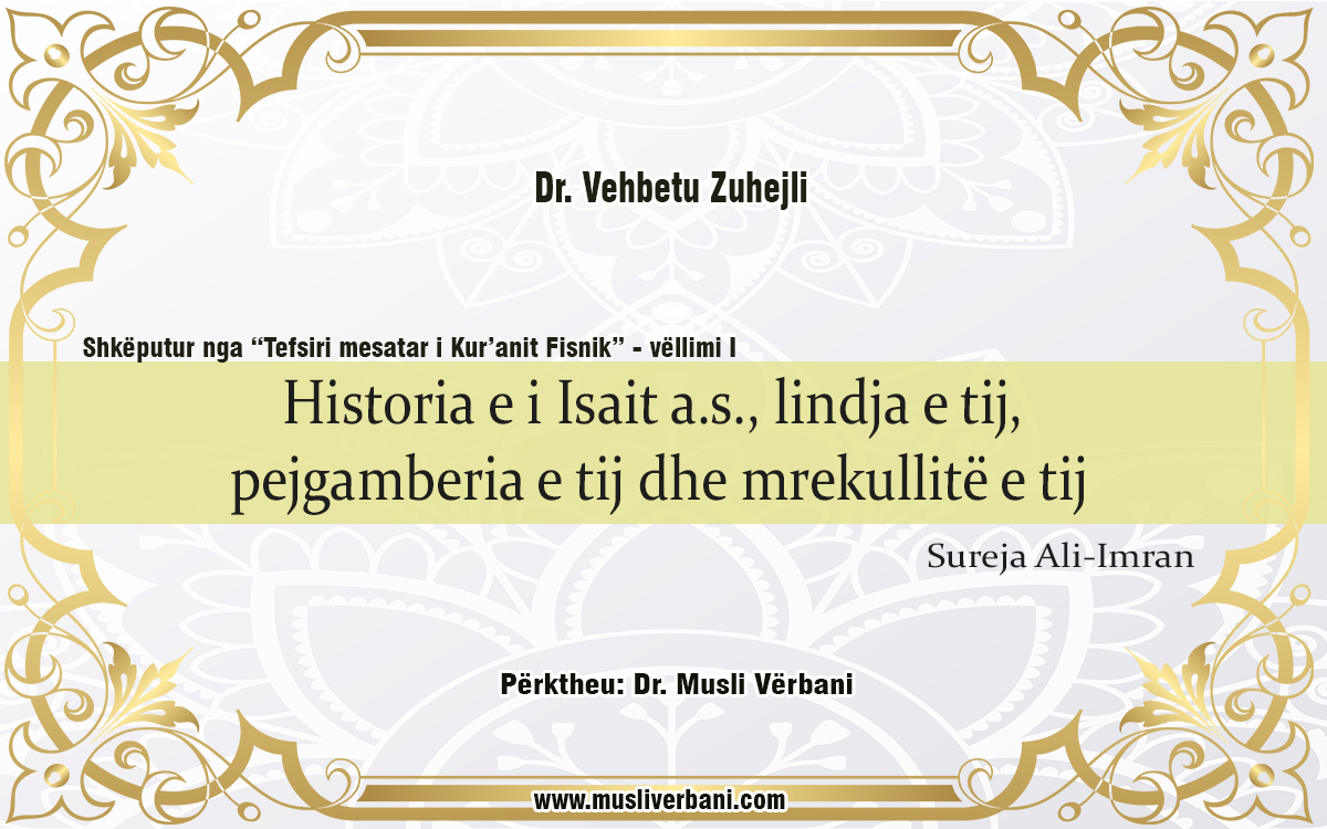 Përkujto kur engjëjt i thanë: “Oj Merjeme, Allahu të përgëzon me fjalën e vet (me lindjen e një fëmije si rezultat i fjalës së Zotit). (45) E që duke qenë në djep (foshnje) u flet njerëzve, e edhe si i rritur e që është nga të përsosurit. (46) Ajo tha: “Zoti im, si mund të kem unë djalë e mua s’më ka prekur njeri (nuk jam e martuar)? Ai (Allahu) tha: “Ja, kështu, Allahu krijon çka të dojë. Kur Ai vendos për një çështje, vetëm i thotë: Bëhu! Ajo menjëherë bëhet. (47) Ai (Allahu) ia mëson atij librin (besimin), urtësinë, Tevratin dhe Inxhilin. (48) Dhe, të dërguar te bijtë e Israilit: unë kam ardhur nga Zoti juaj me argument, unë nga balta ju bëj diç si shpendi, i fryj atij dhe ai me lejen e Allahut bëhet shpend, unë i shëroj të verbrit, të sëmurit në lëkurë, dhe unë me lejen e Allahut ngjalli të vdekurit: unë ju tregoj për atë që e hani dhe për atë që e depononi në shtëpitë tuaja. Vërtetë, ky është fakt për ju nëse jeni besimtarë. (49) Dhe (kam ardhur) që t’ju vërtetoj Tevratin që e keni para duarsh, t’ju lejoj disa që u ishin ndaluar juve, kam ardhur me argument nga Zoti juaj, pra kijeni frikë Allahun dhe më dëgjoni mua. (50) Allahu është Zoti im dhe Zoti juaj. Adhurojeni Atë; kjo është rrugë më e drejtë! (51)