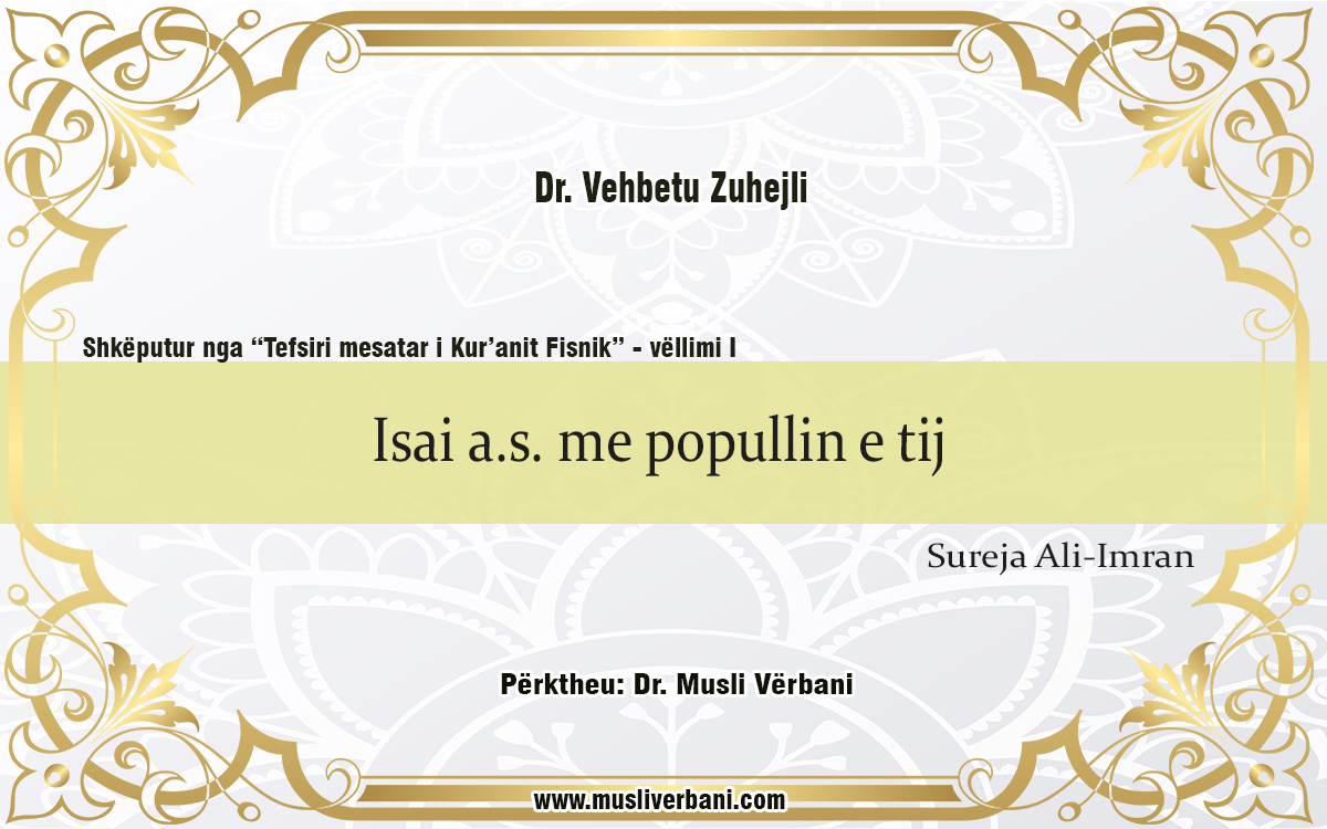 E kur e kuptoi Isai vendosmërinë e tyre në mosbesim (dhe qëllimin që ta mbysin), tha: ‘Kush janë ndihmëtarët e mi për në rrugë të Allahut?’ Havarijunët thanë: ‘Ne jemi ndihmëtarë të fesë së Allahut, ne i besuam Allahut, e ti dëshmo për ne se jemi muslimanë (të bindur, të dorëzuar)! (52) Zoti ynë, ne e besuam atë që e zbrite (shpalljen), e pasuam të dërguarin (Isain), pra shënona bashkë me ata që dëshmojnë (besimin e drejtë)!’ (53) E, ata (jehudët) i kurdisën një dredhi (mbytjen e Isait), Allahu iu kundërvu dredhisë së tyre, Allahu është asgjësuesi më i fuqishëm kundër atyre që bëjnë dredhi. (54) (Përkujto, o i dërguar) Kur Allahu tha: ‘O Isa, Unë po të marr ty, po të ngriti te Unë, po të shpëtoj prej sherrit të atyre që nuk besuan. E ata që të besuan ty, do t’i ngriti lart mbi ata që nuk besuan deri në ditën e kijametit, pastaj vetëm te Unë është kthimi juaj, Unë gjykoj mes jush për atë që kundërshtoheshit. (55) Për sa u përket atyre që nuk besuan, Unë do t’i ndëshkoj me një ndëshkim të ashpër në këtë botë dhe në botën tjetër, dhe ata nuk do të kenë ndihmëtarë. (56) E për sa u përket atyre që besuan dhe bënë vepra të mira, atyre u japë shpërblim të plotë. Allahu nuk i do të padrejtit. (57) Këto që po t’i lexojmë ty (o i dërguar) janë nga ajetet, janë nga Kur’ani i pa të meta (i rezistueshëm). (58) Vërtet, çështja e Isait (të lindur pa baba) te Allahu është sikurse çështja e Ademit. Atë e krijoi Ai nga dheu, e pastaj atij i tha “Bëhu!” ai u bë. (59) E vërtetë është (kjo) nga Zoti yt, e ti kurrsesi mos u bën nga ata që dyshojnë. (60) E kush të kundërshton ty në çështjen e tij (Isait) pasi të është bërë e ditur e vërteta, ti thuaj: ‘Ejani i thërrasim bijtë tanë dhe bijtë tuaj, gratë tona dhe gratë tuaja, vetë ne dhe vet ju, mandej sinqerisht të lutemi për mallkim, dhe mallkimin nga ana e Allahut ta hedhim kundër gënjeshtarëve. (61) S’ka dyshim, ky është lajm i vërtetë. Nuk ka asnjë të adhuruar tjetër pos Allahut. Allahu është Ai, i plotfuqishmi, i vetëdijshmi. (62) E nëse ata refuzojnë (besimin e drejtë), ata janë ngatërrestarë, për të cilët Allahu e di shumë mirë. (63)