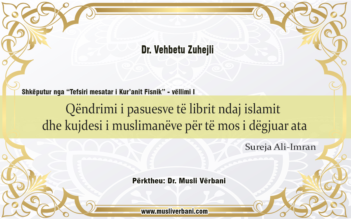 Thuaj: “O ithtarë të librit, përse i mohoni ajetet (argumentet) e Allahut? E Allahu mbikëqyr atë që veproni. (98) Thuaj: “O ithtarë të librit, përse e pengoni atë që besoni nga rruga e Allahut, duke u angazhuar që ta paraqitni atë të shtrembër, ndërsa vetë ju, jeni dëshmues se është e vërtetë! Veprimi juaj nuk mund t’i shmanget mbikëqyrjes së Allahut. (99)