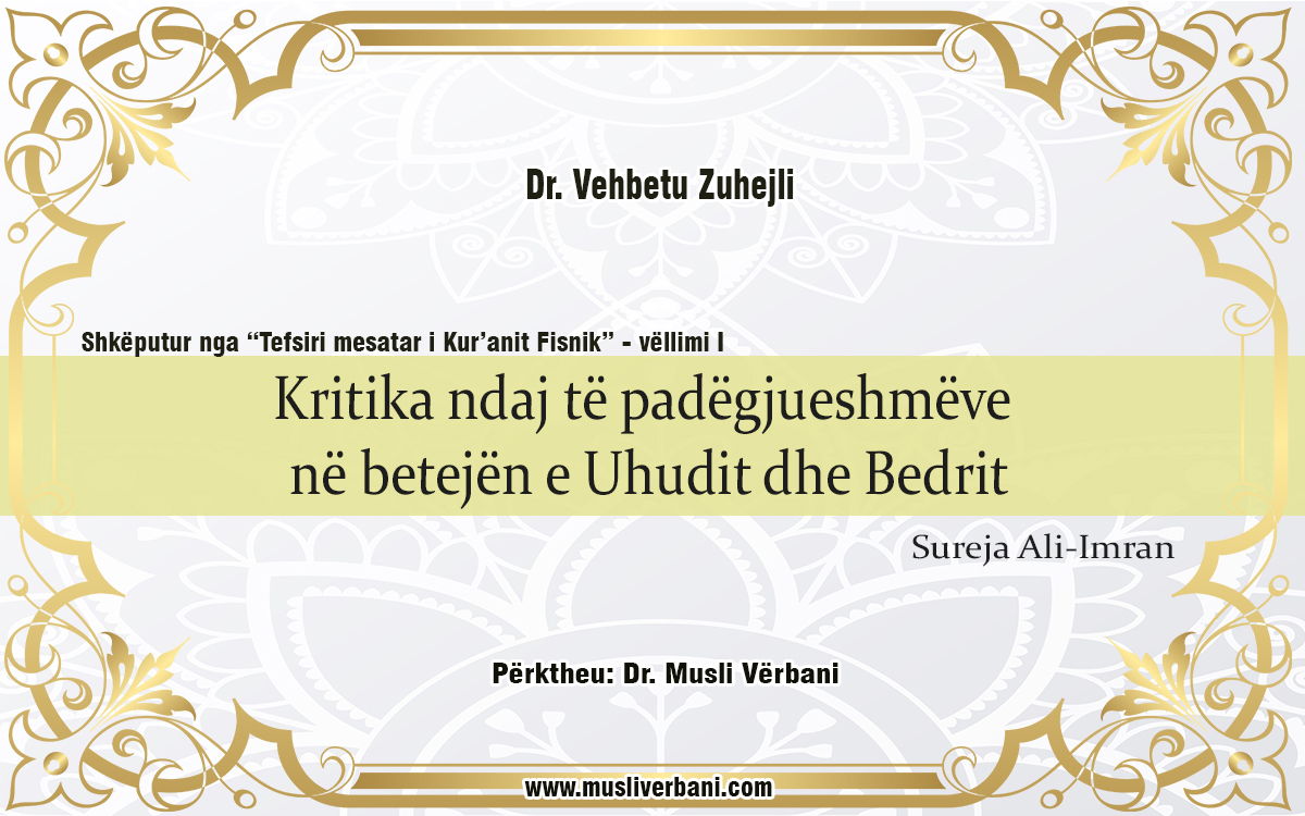 A mos menduat ju se do të hyni në Xhenetet e Allahut pa i ditur (pa u vërtetuar) në praktikë se cilët prej jush kanë luftuar, dhe pa u ditur cilët prej jush ishin të durueshëm. (142) Ju ishit ata që dëshironit vdekjen para se të ballafaqoheshit me të. Ja pra, atë e patë dhe e shikuat me sytë tuaj. (143) Muhamedi nuk është tjetër vetëm se i dërguar. Edhe përpara tij pati të dërguar (që vdiqën ose u vranë). E nëse ai vdes ose mbytet, a do të ktheheshit ju prapa (nga feja ose lufta)? E kushdo që kthehet prapa, ai nuk i bën dëm Allahut aspak, kurse Allahu do t’i shpërblejë mirënjohësit. (144)