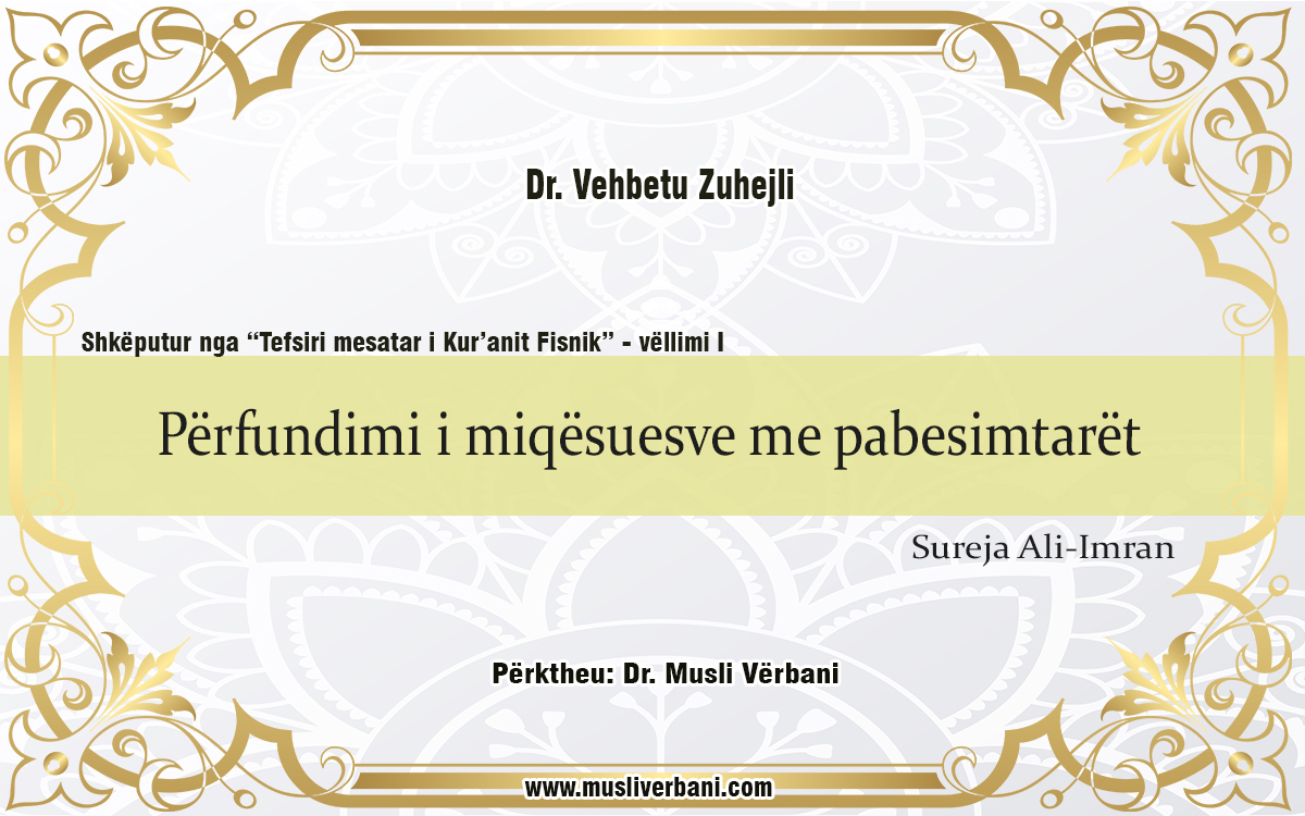 O besimtarë, nëse u nënshtroheni jobesimtarëve, ata ju kthejnë prapa aty ku ishit (në kufër) dhe atëherë do të jeni të humbur. (149) Sepse vetëm Allahu është ndihmëtar i juaji dhe Ai është më i miri ndihmës. (150) Ne do të mbjellim frikën në zemrat e atyre që nuk besuan sepse ata Allahut i trillojnë dhe i mveshin zota të tjerë, duke mos pasur për të kurrfarë fakti, andaj vendbanimi i tyre do të jetë xhehenemi. Sa i shëmtuar është vendi i mizorëve. (151)