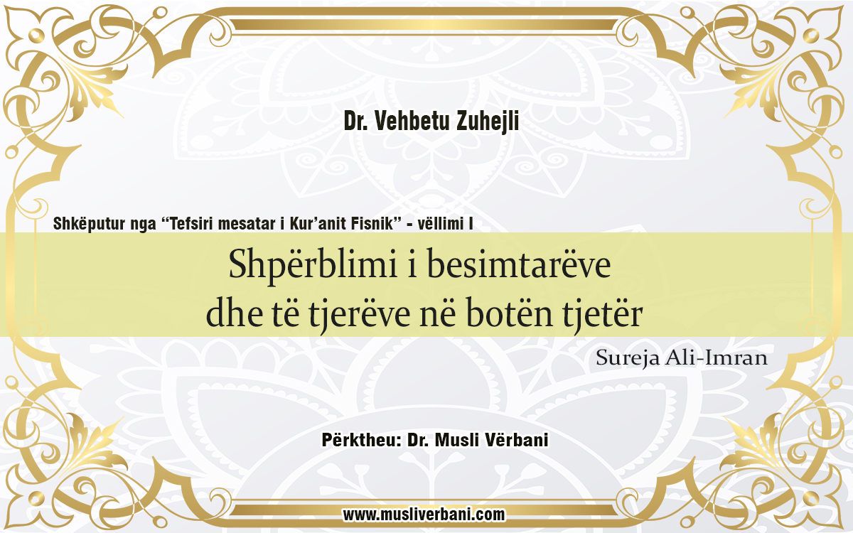 Të mos mashtrojë bredhja nëpër qytete e atyre që nuk besuan. (196) Ajo është një kënaqësi e pakët, e pastaj vendi i tyre është Xhehenemi që është vend mjerimi. (197) Por ata që ia patën frikën Zotit të tyre, ata i kanë Xhenetet nëpër të cilat rrjedhin lumenj dhe aty janë përgjithmonë. Ajo është pritje nga ana e Allahut, e për të mirët më e dobishmja është ajo që është te Allahu. (198) Po edhe nga ithtarët e librit ka që besojnë Allahun, e besojnë atë që u është shpallur juve, e besojnë atë që është shpallur atyre, janë të bindur ndaj Allahut në shpallje nuk i shesin për pak send të kësaj jete. Të tillët kanë shpërblimin e vet te Zoti i tyre, e Allahu është që llogarinë e bën shpejt. (199) O ju besimtarë, bëni durim, bëhuni të qëndrueshëm kundër armikut, rrini të përgatitur dhe, që të shpëtoni, ruajuni dënimit të Allahut. (200)
