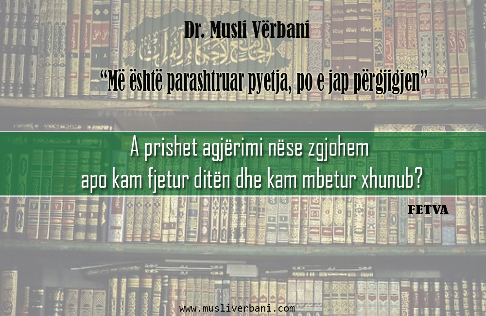 Fikh A prishet agjërimi nëse zgjohem apo kam fjetur ditën dhe kam mbetur xhunub? Dr. Musli Vërbani – Përgjigjja: Jo, agjërimi vazhdon dhe është në rregull agjërimi i asaj dite. Ndajeni këtë me të tjerët: Ndajeni me të tjerë në X (Hapet në një dritare të re) X Ndajeni me të tjerët në Facebook (Hapet në një dritare të re) Facebook Pëlqejeni Po ngarkohet… Të afërta