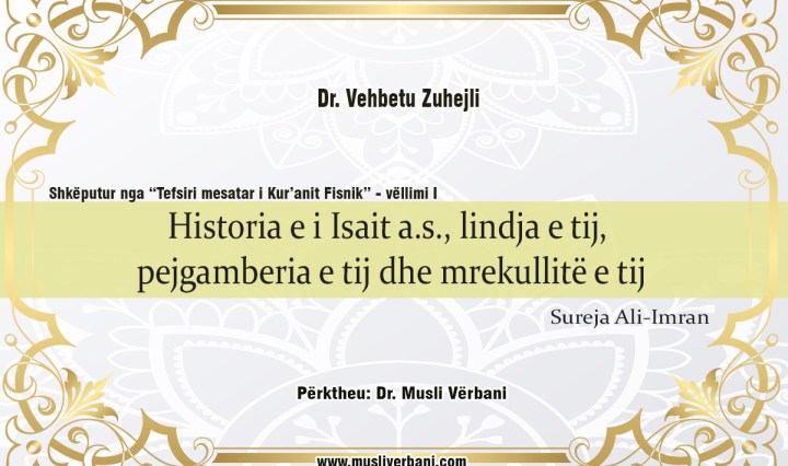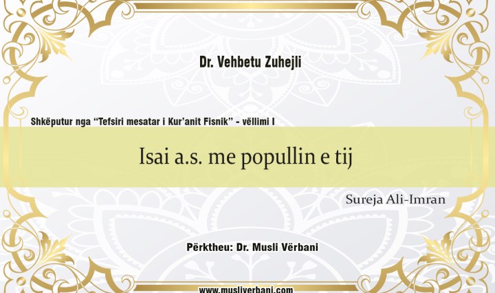 “Tefsiri mesatar i Kur’anit fisnik” – Vëllimi 1 Autor: Dr. Vehbetu Zuhejli Përktheu: Dr. Musli Vërbani – Isai a.s. e ka ftuar popullin e tij Israilit për të adhuruar vetëm Allahun. Disa prej tyre i besuan, të tjerët e refuzuan, … Vazhdoni leximin Isai a.s. me popullin e tij